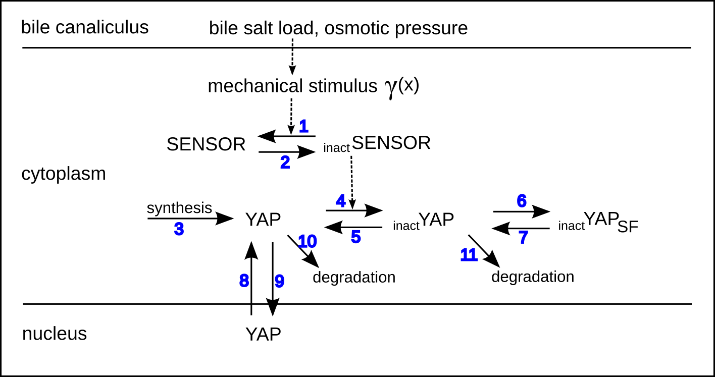 For the spatio-temporal dynamics of bile transport, bile canalicular dilation, mechanical stimulation and transduction of YAP signaling during liver regeneration see the open access publication and its appendix: Meyer et al. (2020) Bile canaliculi remodeling activates YAP via the actin cytoskeleton during liver regeneration. Molecular Systems Biology 16:e8985. https://doi.org/10.15252/msb.20198985